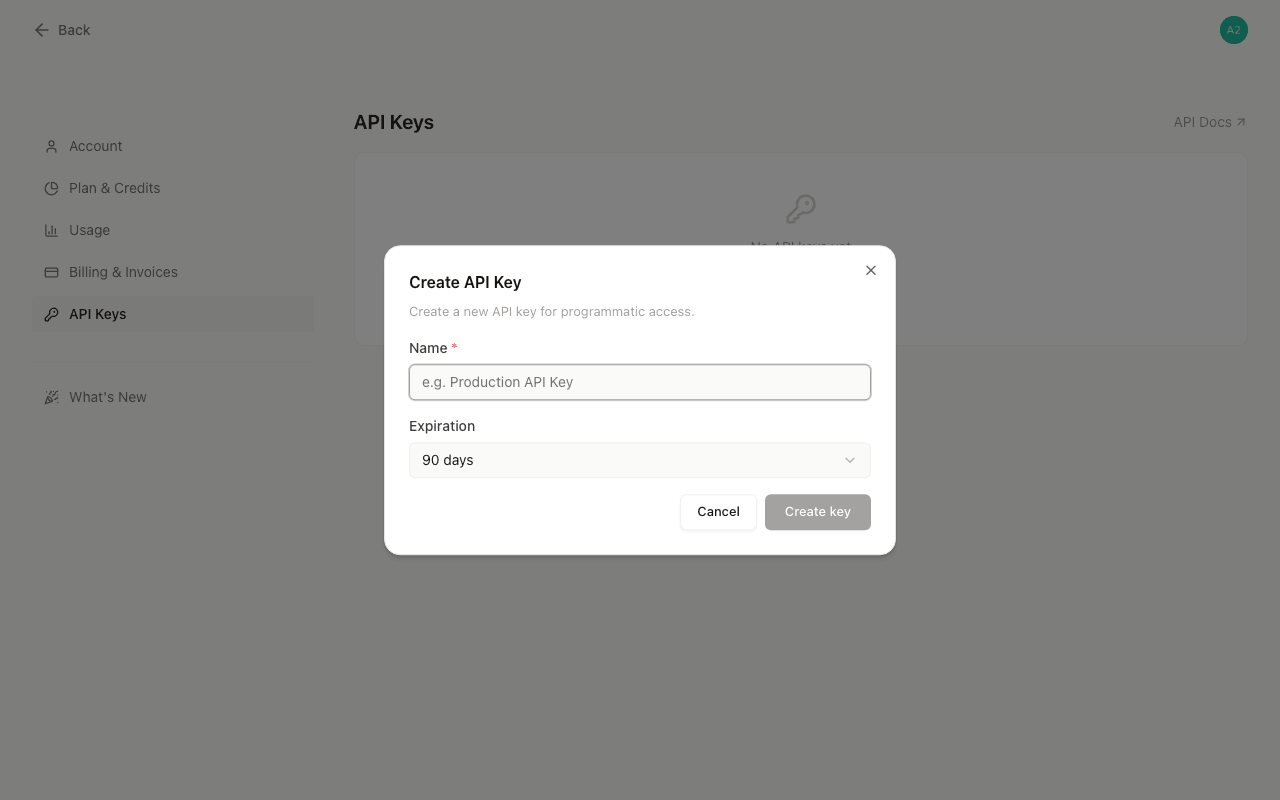 Enter a name for the key (required, up to 100 characters). Use something descriptive like “Production” or “CI Pipeline” so you can identify it later.