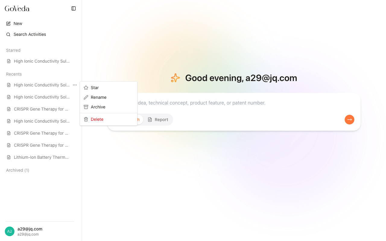 GoVeda automatically saves your activity so you can return to past work without re-running searches or regenerating reports. History is tied to your account and requires you to be signed in.
