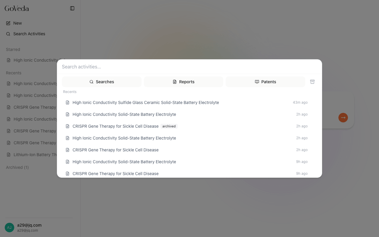 The sidebar includes a Search Activities button. Clicking it opens a dialog where you can search across all of your history by keyword and filter by type (Searches, Reports, Patents, or Archived).