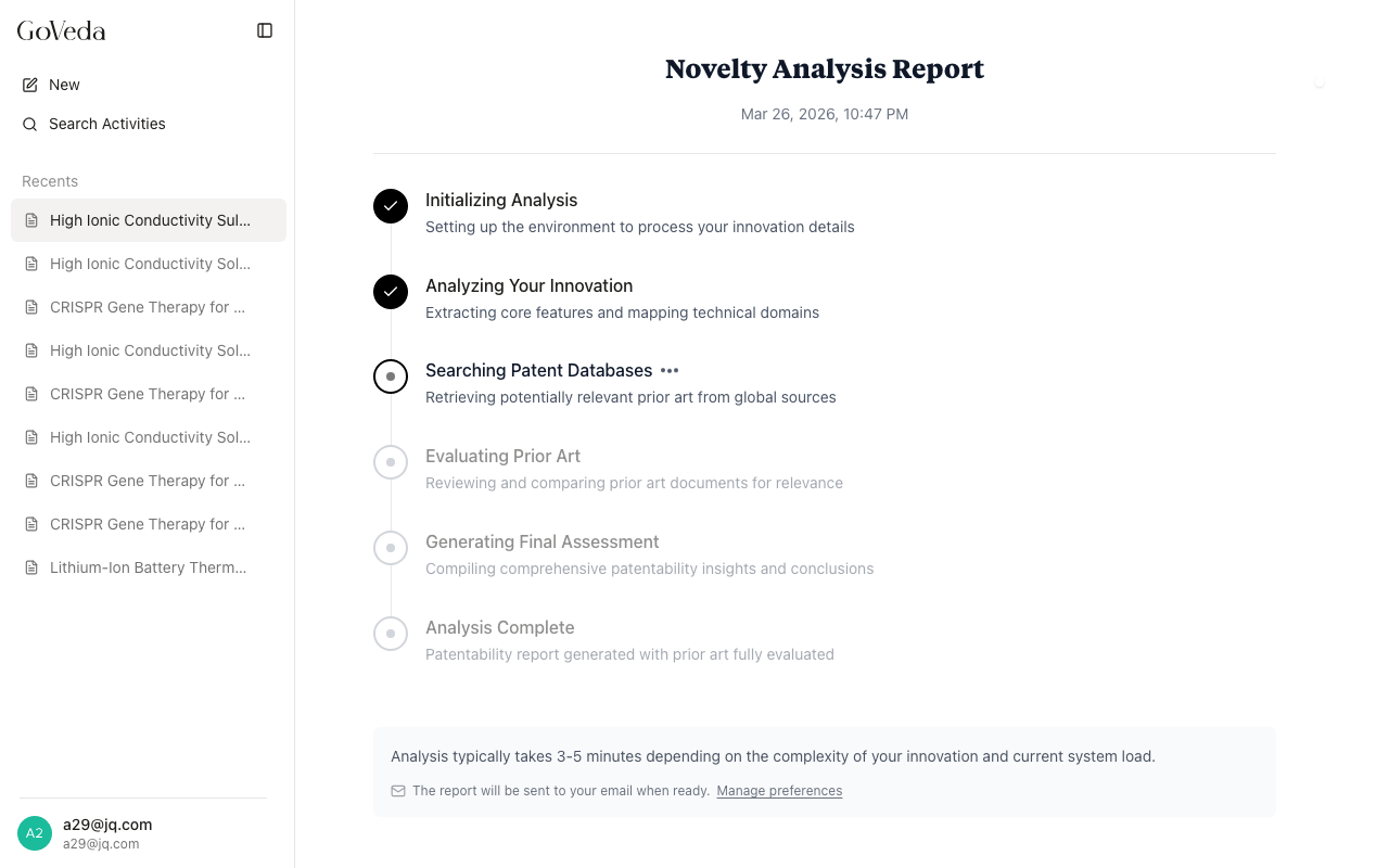 You can leave the page and return later. If you are not signed in, you can enter an email address while the report is generating. GoVeda will send you the result when it is ready. Signed-in users can manage email notification preferences in their profile settings.